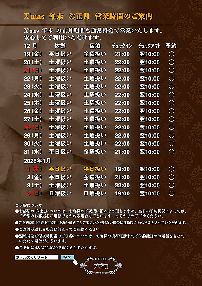 曜日 休憩 宿泊 チェックイン チェックアウト 予約