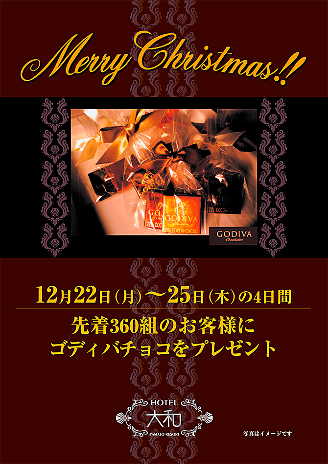 12月22日(月)~25日(木)の4日間、先着360組のお客様にゴディバチョコをプレゼントいたします。