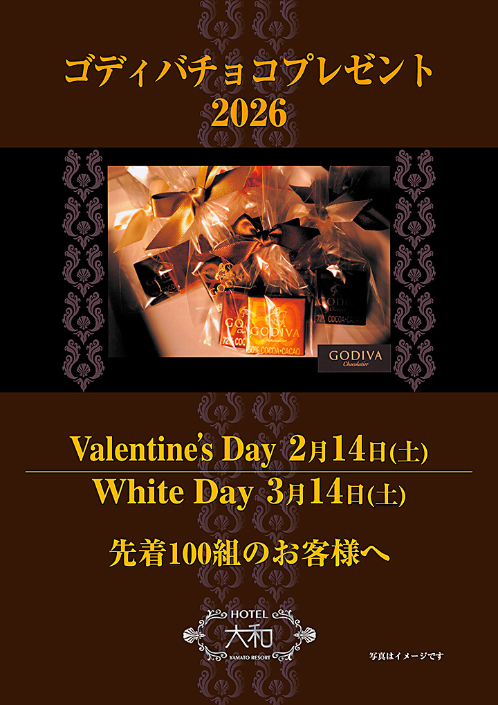 バレンタインデー、ホワイトデーにホテル大和をご利用の先着100組のお客様へ、ゴディバチョコをプレゼントいたします。